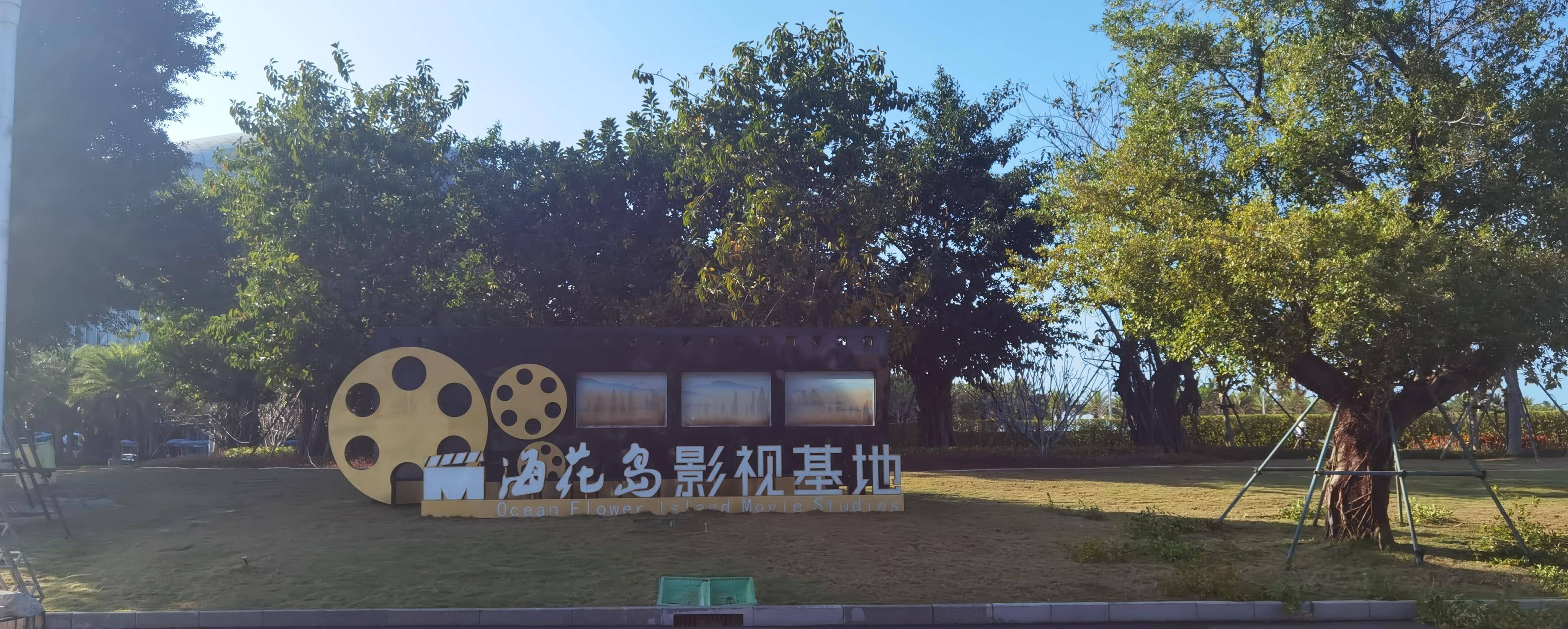 我们顺着马路逆时针行走,路边的草坪上摆放着“海花岛影视基地”的LOGO,后面的绿地里应该就是影视基地,它和童世界在一个花瓣里,看样子还没建好。