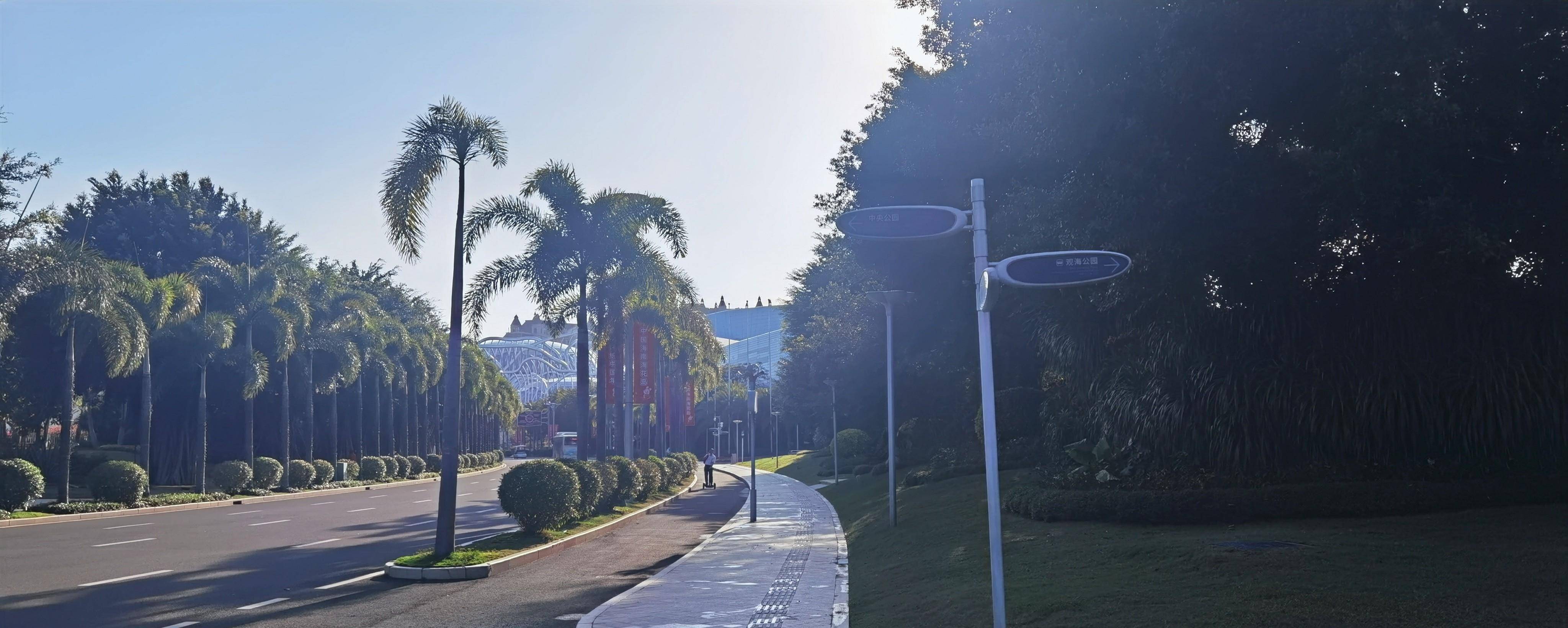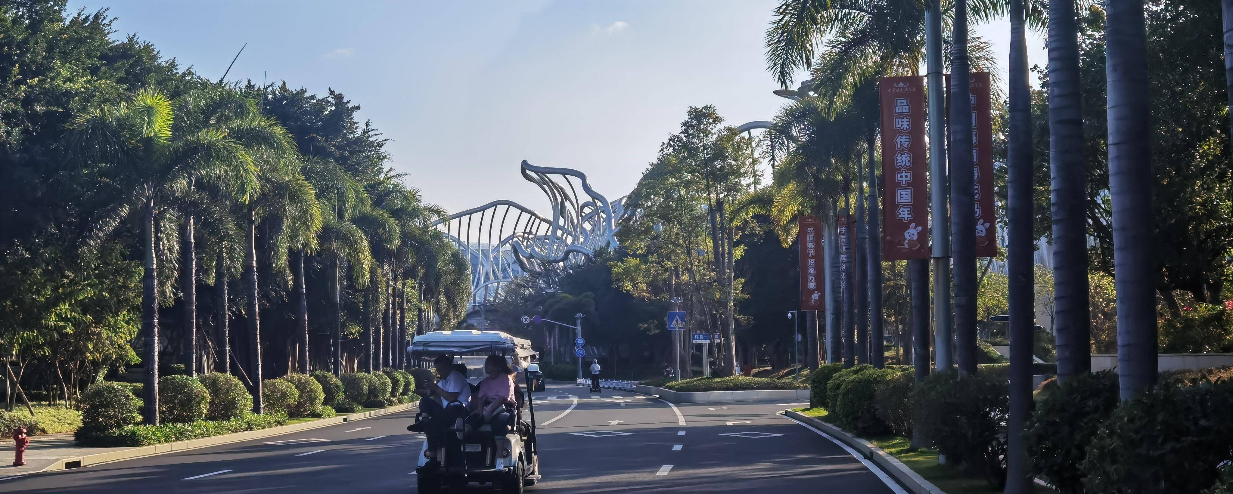 海花岛的绿化真好,整齐的椰子树像笔直的卫兵,整齐地列队欢迎着大家,把路引向远方。