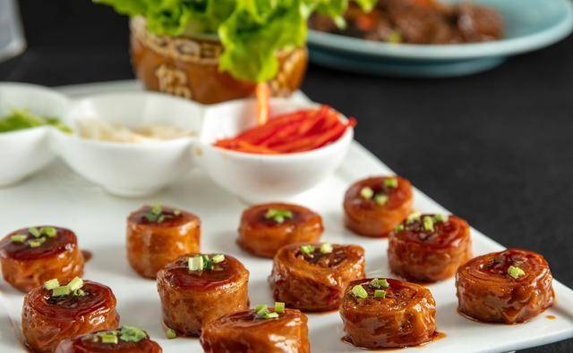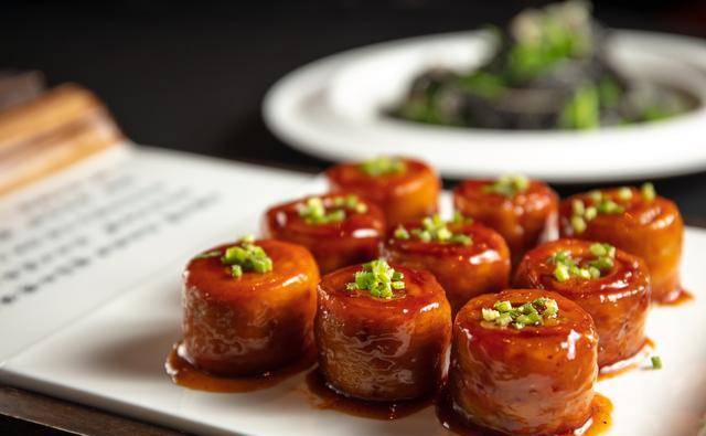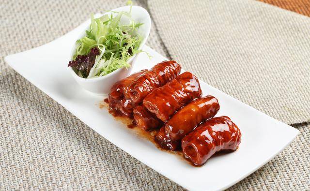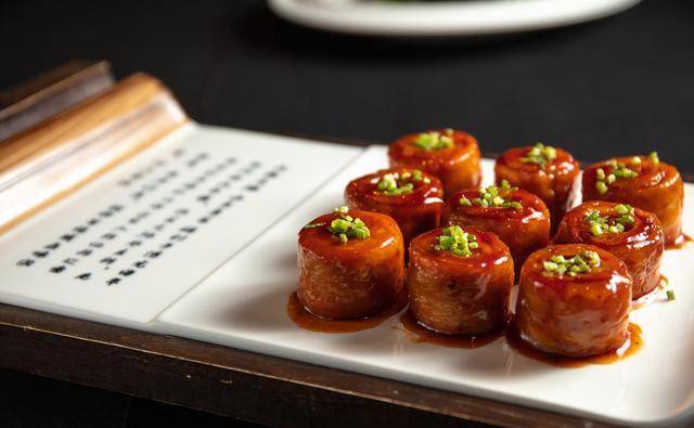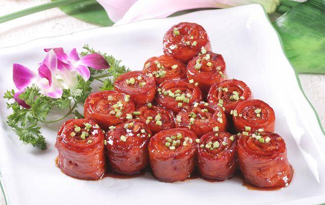 九转大肠,首先要从外观说起。它看起来有点像那个著名的水晶鞋,晶莹剔透,十分诱人。如果你不小心看见了它,那么一定会被它那诱人的外表所吸引,心里充满了对它的美味的向往。