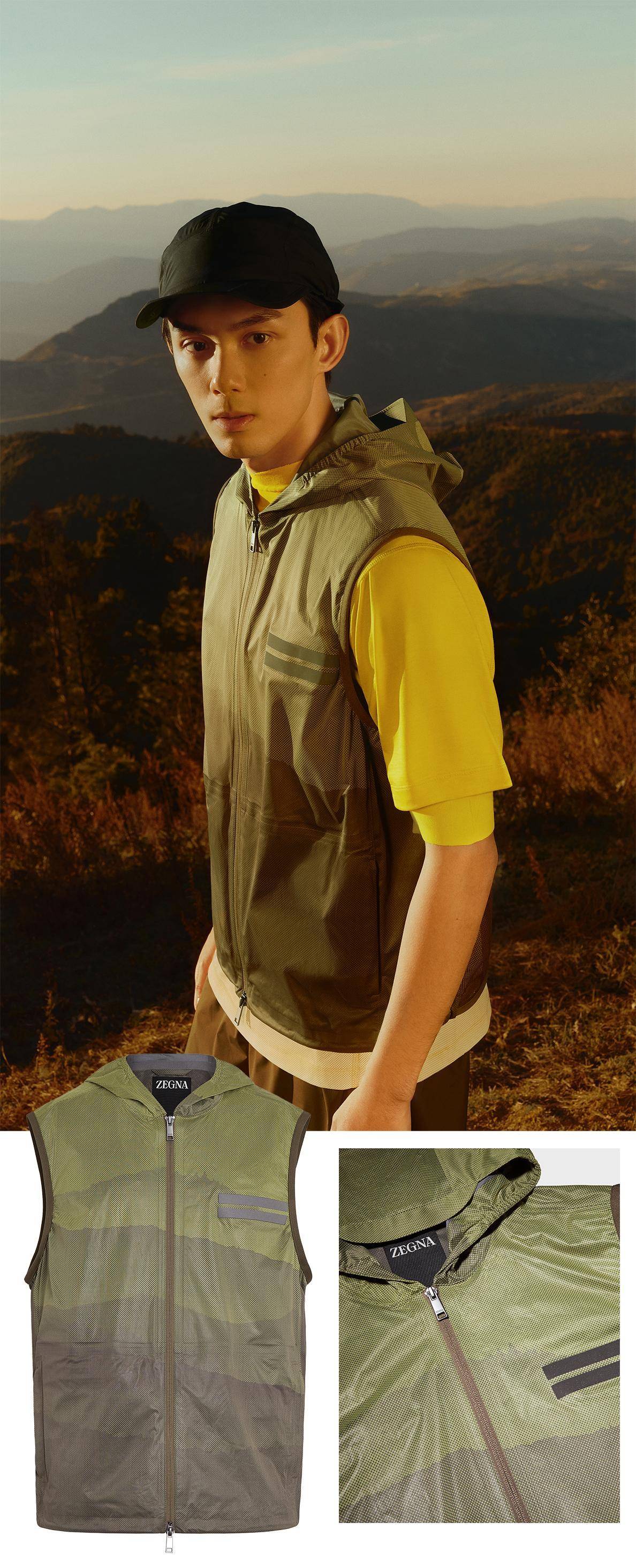 另一套造型当中,吴磊选择的外搭则是一款连帽背心单品:军绿色主调以渐变形式呈现,背后则与大面积棕色网纱相拼接,醒目而出众;高科技面料精工打造,防水性能优越;搭载帽兜、拉链口袋等实用设计带来便利,伴你无畏共赴冒险之旅。