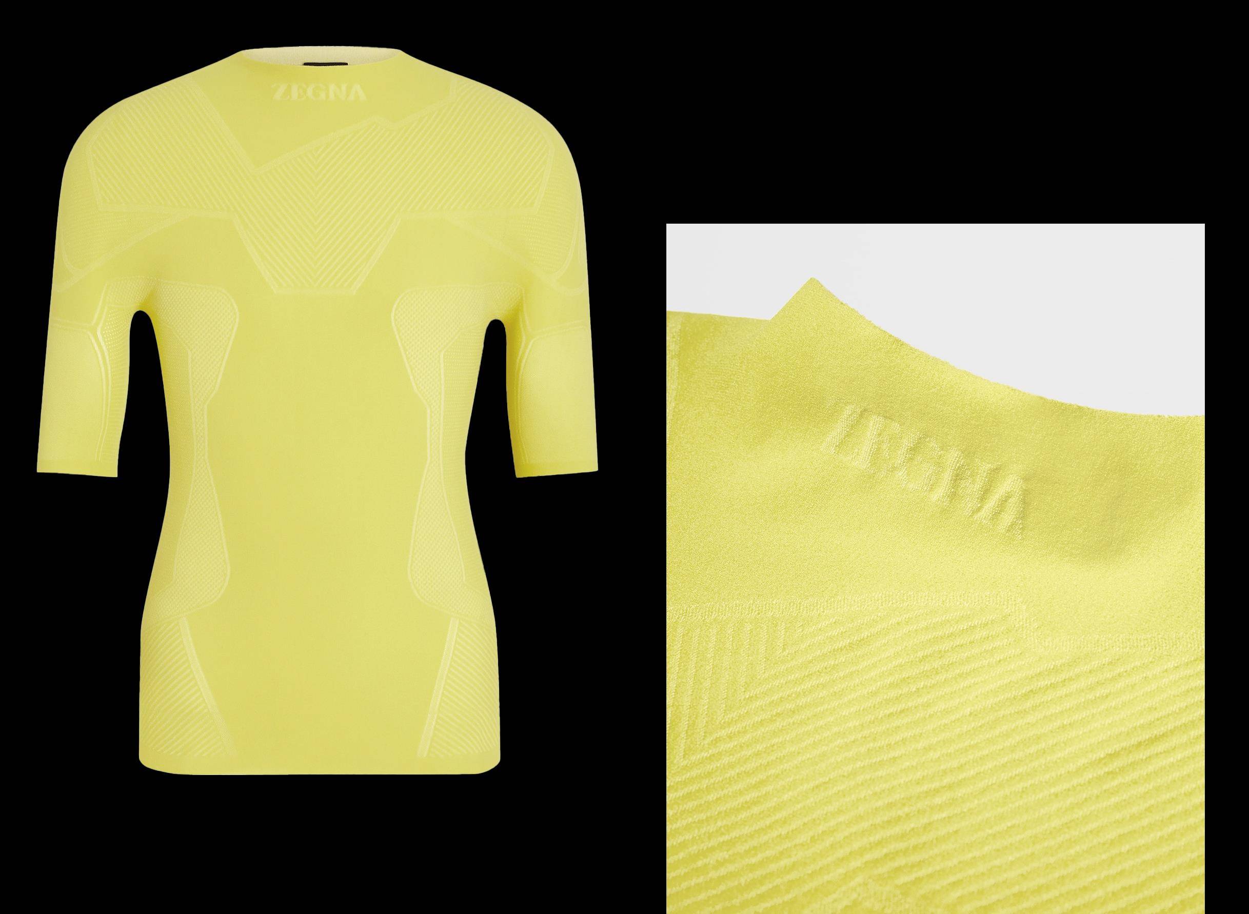 应对户外环境,穿着在外的服饰需要抵挡风雨,贴身穿着的内搭也不容忽视,而吴磊所身着的这款黄色高科技面料短袖T恤,就是不错的选择:无缝结构配合修身版型,弹性出众、质感舒适,十分适合探索户外时穿着;而高领设计之上又暗含ZEGNA标识刺绣,与亮眼的明黄色相搭配,作为时尚造型的内搭也相当个性。