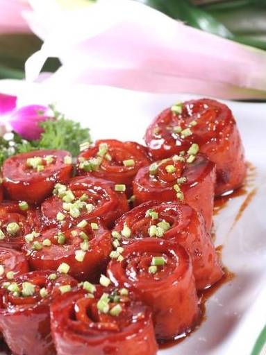 (3)烧开后转小火煨1分钟左右,转回大火收汁,加入白胡椒粉,米醋,再烧一会,收汁至浓稠,加入芝麻油10克翻锅,把大肠整齐码放盘子里,香菜伴边。