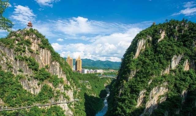 今天小编为大家介绍的,就是其中一个大型自然景区,它耗资400亿建成,还被誉为重庆明珠,这个景区就是“黔江峡谷城”。黔江峡谷城地处于黔江区境内,它是一条长8公里,深200多米的自然峡谷,属于非常典型的喀斯特地貌。景区两旁的山上,皆是郁郁葱葱的山脉,而在峡谷之中,却是一条湍流涌动的河流,如此壮观,不用说在当地,就是在全国也是非常少见的景点。