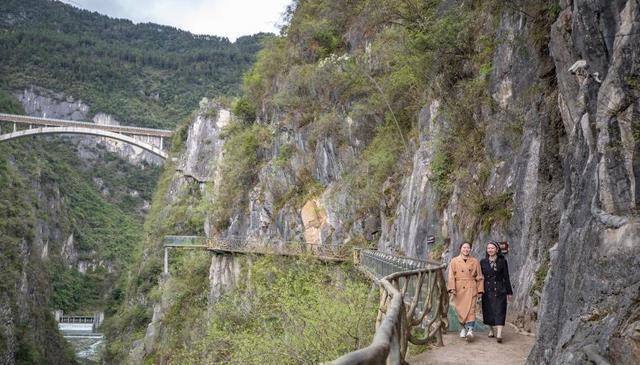 还未走进景区,大家就可以听到湍急的河水流动之声,走进景区,大家就会发现景区一个奇特之处,景区的道路既不在山顶之上,也不在河流之旁,而屹立在如同刀劈斧砍出来的悬崖绝壁之中,这条窄只有五米宽,而下面就是万丈悬崖,所以有些胆子小的游客,走在上面会情不自禁的腿软。