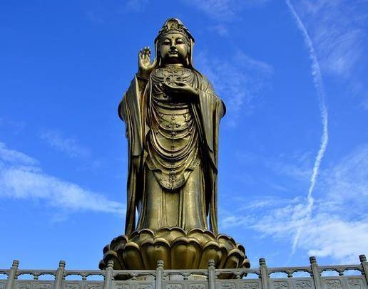 这座观音像名为南海观音,它屹立在龙湾岗巅,海观音立像总高33米,仿佛在环视整个舟山群岛,给人一种油然而生的祥和之意。南海观音像左手托法轮,右手施无畏印,端正慈祥,据说只要在上香之时,默念“南无观世音菩萨”,拜完右手撑起身体,右转离开,许下的愿望就会应验。