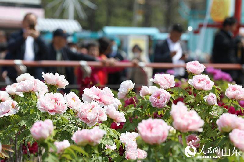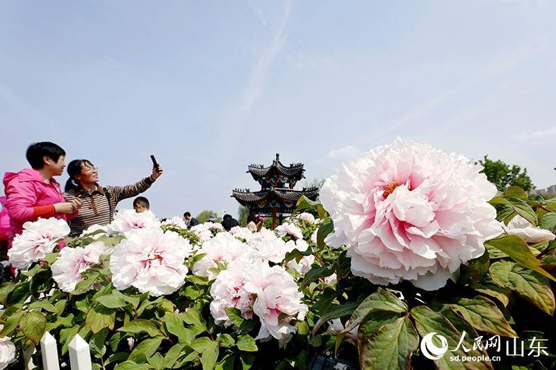 在菏泽牡丹区曹州牡丹园,牡丹花迎来盛放,引游客来拍照打卡。人民网 刘祺摄