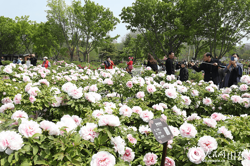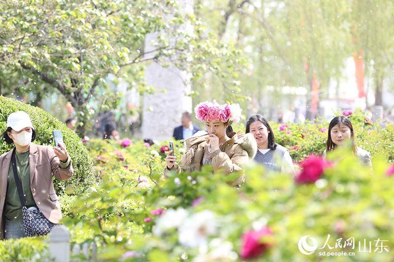 在菏泽市牡丹区曹州牡丹园内,游客纷纷拍照打卡。人民网 刘祺摄