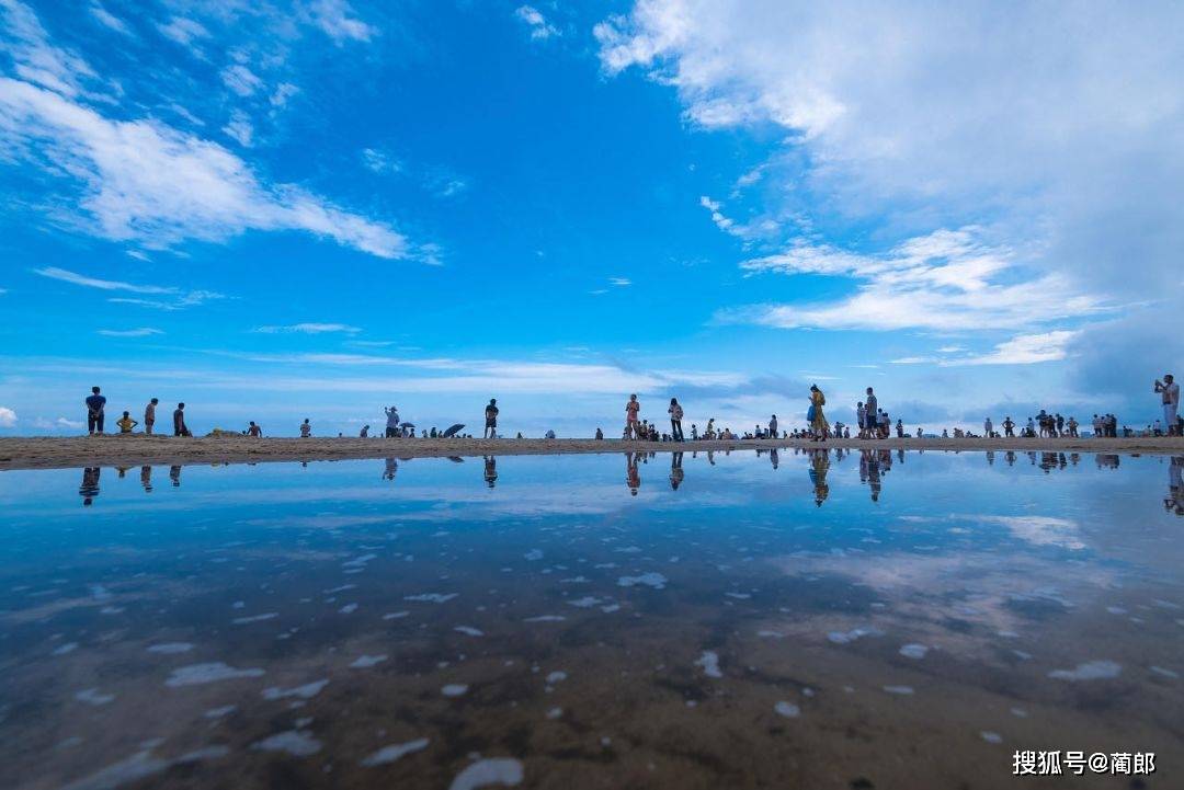 六公里的金色沙滩、碧绿的大海、湛蓝的天空、飘动的白云,不远处的加井岛,构成了一幅美轮美奂的图画。