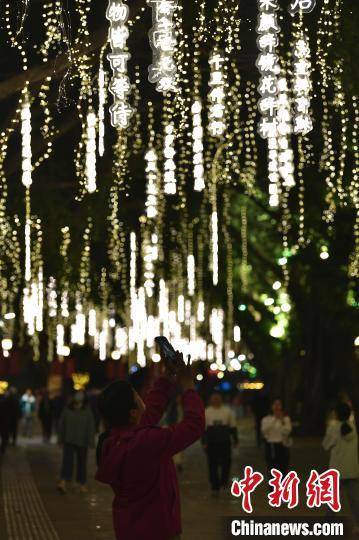 图为一条条诗词灯串灯饰挂在树上,流光溢彩,吸引了不少游客拍照打卡。 张斌 摄
