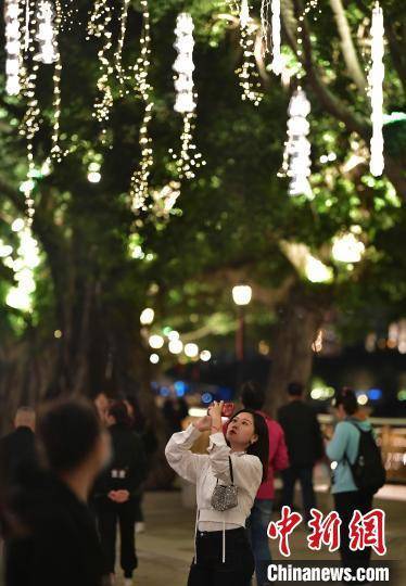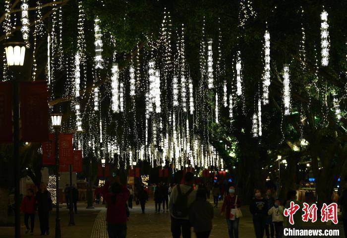 4月8日晚,在福州市“闽江之心”,一条条诗词灯串灯饰挂在树上,流光溢彩,吸引了不少游客拍照打卡。福州打造的首条诗词大道,全长有500多米,现场悬挂有100多句诗词,让大家在观赏的同时也能学习唐诗宋词,弘扬中华优秀传统文化。