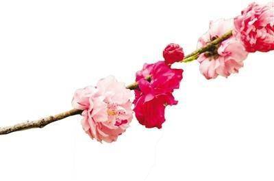 除了木本绣球,杭州植物园内还有个特别的桃花品种也开得异常热闹。枝头白色和玫红色的桃花长在一起,或是白花上夹着玫红色的花瓣,或是白色花瓣上带着玫红色条纹。工作人员告诉记者,这是撒金碧桃,它们拥有出其不意的“双色拼配”。