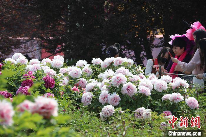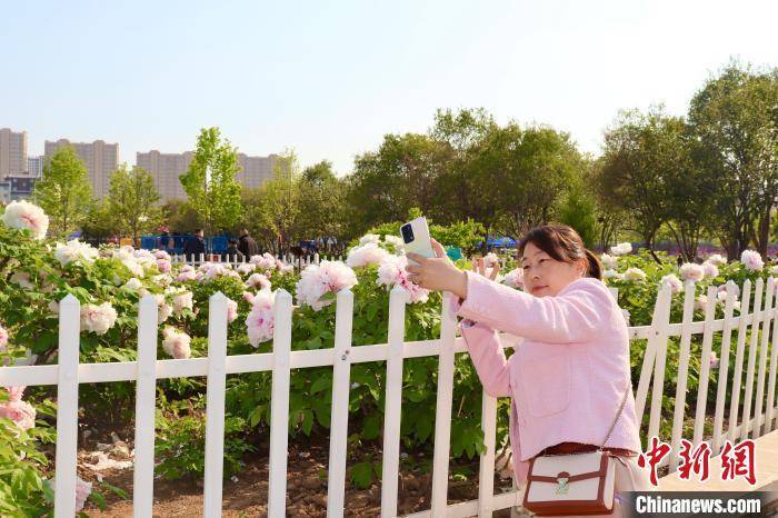市民游客观赏牡丹,拍照留念。 李明芮 摄