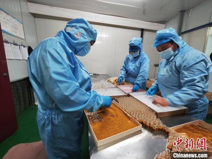 工作人员正在分装牡丹花蕊茶。 孙安琪 摄