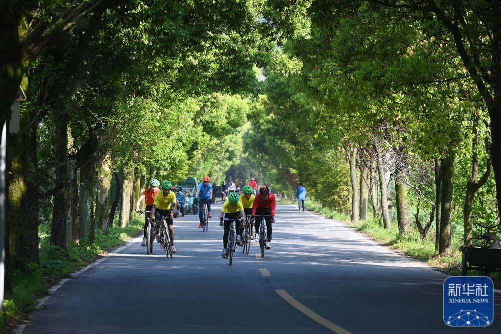 ↑4月8日,骑行爱好者在浙江省诸暨市赵家镇香榧国家森林公园参加健身骑行活动。