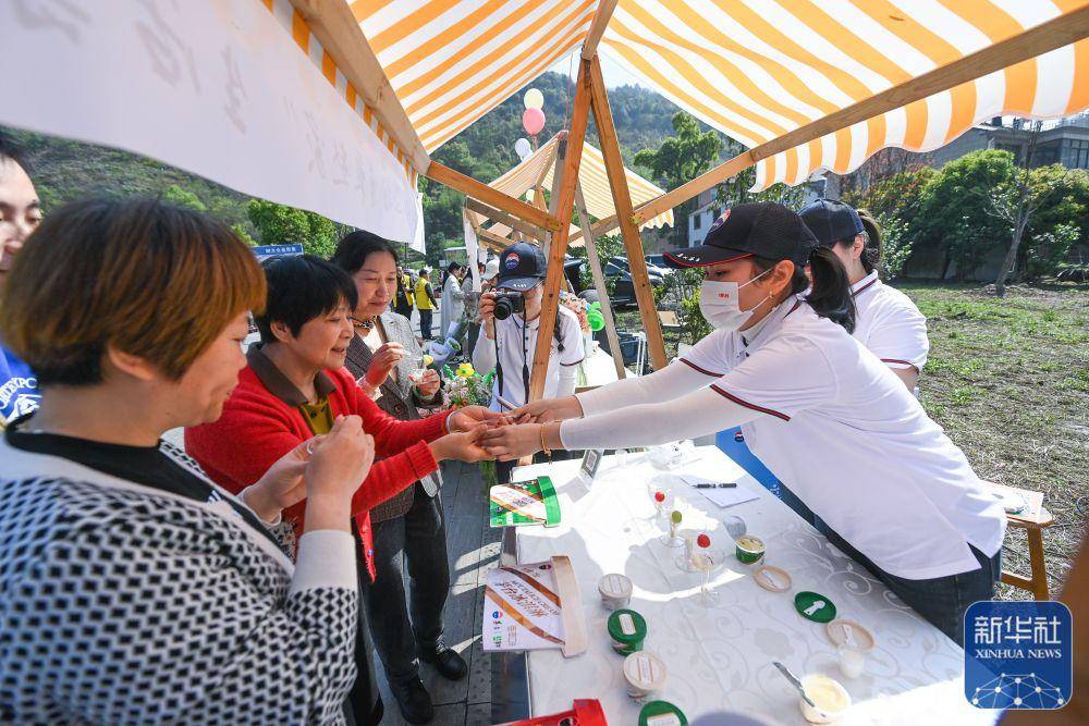 ↑4月8日,浙江省诸暨市赵家镇东溪村举行的春日山野市集设置免费摊位,推广优质农副产品以及网红美食,吸引游客前来了解选购。
