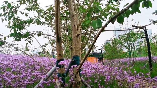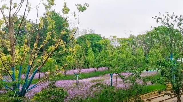 从园区大门进,走几步路就可以看到马鞭草的种植区。相对而言,这个区域的面积也不大,主要是马鞭草,也有其他的植被,完整的布局是以行道树为主,香樟树和白杨树多,贴着围墙建设,将外面的热闹阻挡。其次是树下的盆栽和草坪,种植密度大,春天才到,草坪就恢复了嫩绿色,长势良好。最后是园区里的观景点,建设完成度不错,可能是位置太过难找,目前人流量有限,反而是周边小区的高楼,鸟瞰之下,这一座园林能够看得完整。