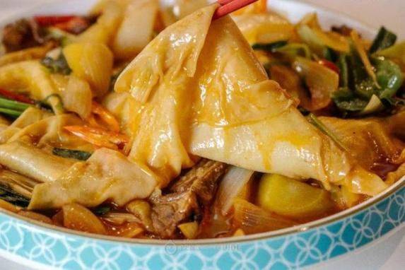 美味的羊肉先下锅爆炒,然后加入配菜,最后将面饼轻铺在上面慢炖。