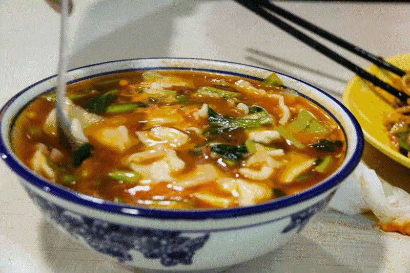 揪面片虽然是面食,做法却犹如炒面,味道鲜香可口,汤汁浓郁。来上一碗揪片子,温胃润肠。