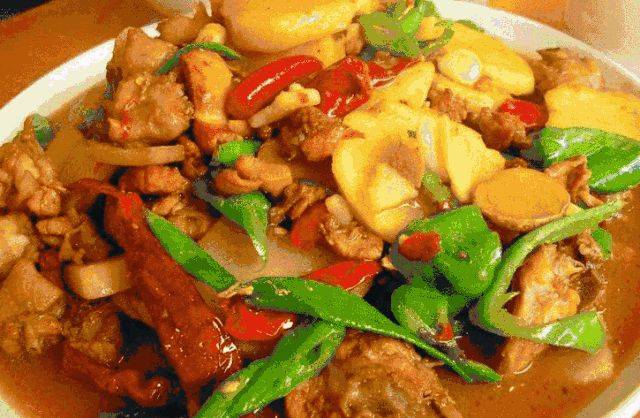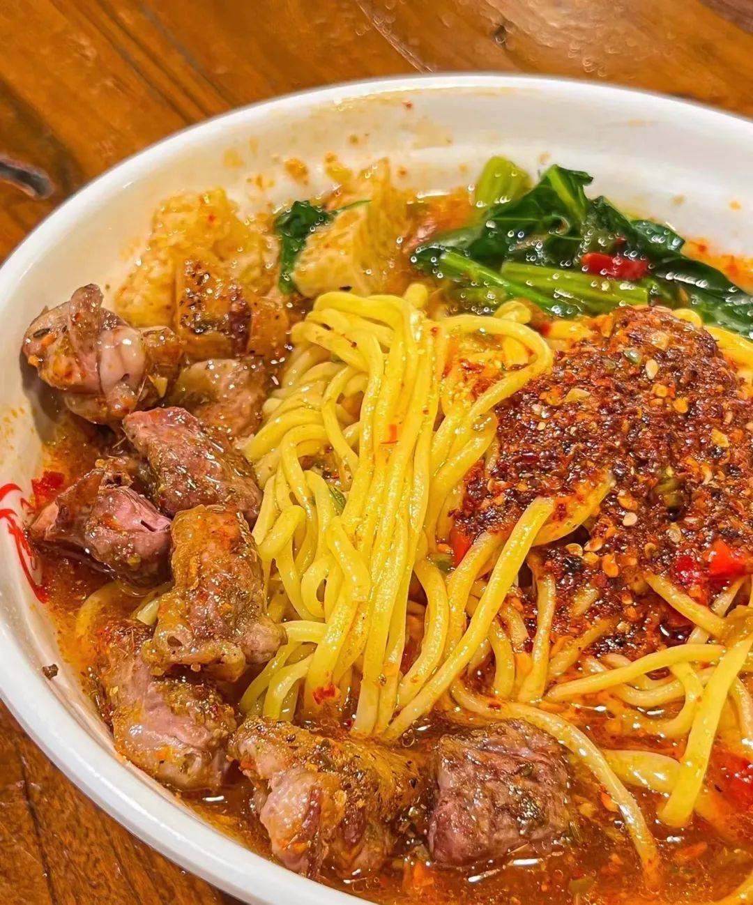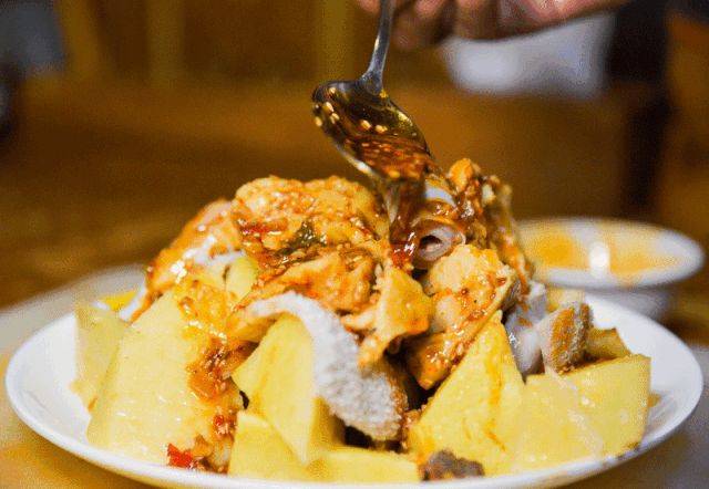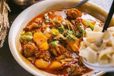 皮带面裹着大盘鸡的酱汁,麻辣嫩滑,来一碗皮带面配上大盘鸡沙绵的土豆、鲜嫩的鸡肉,吃起来让人酣畅淋漓。
