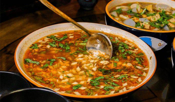 用原汁原味的肉汤煮面条或是面片,煮熟捞出后,平铺在盘底,撒上新鲜的皮牙子,浇上羊肉汤汁,让每一片面片都饱蘸汤汁,再把带骨羊肉摆入盘中,一份香喷喷的纳仁就做好了。