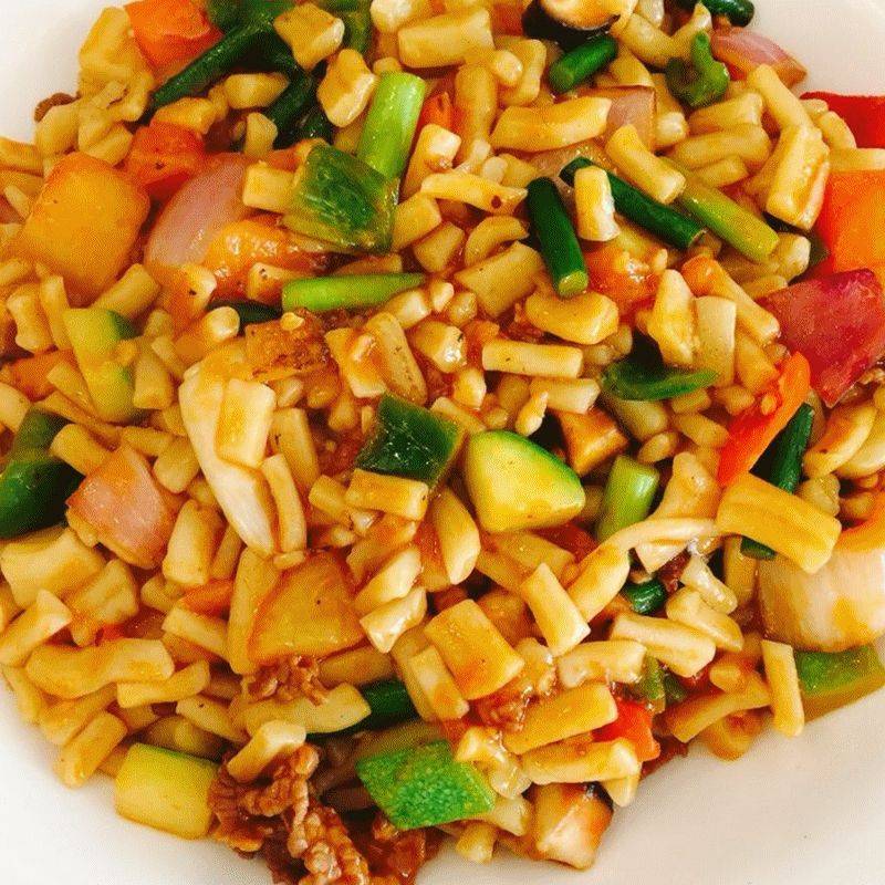 在新疆餐厅点餐,光面食类菜单都会看很久,因为新疆炒面的种类真的很多繁多,如丁丁炒面、新疆炒拉条子面、新疆炒面片、二节子炒面、干煸炒面等,一般都使用高筋面粉,所以面条都很劲道且有嚼劲。