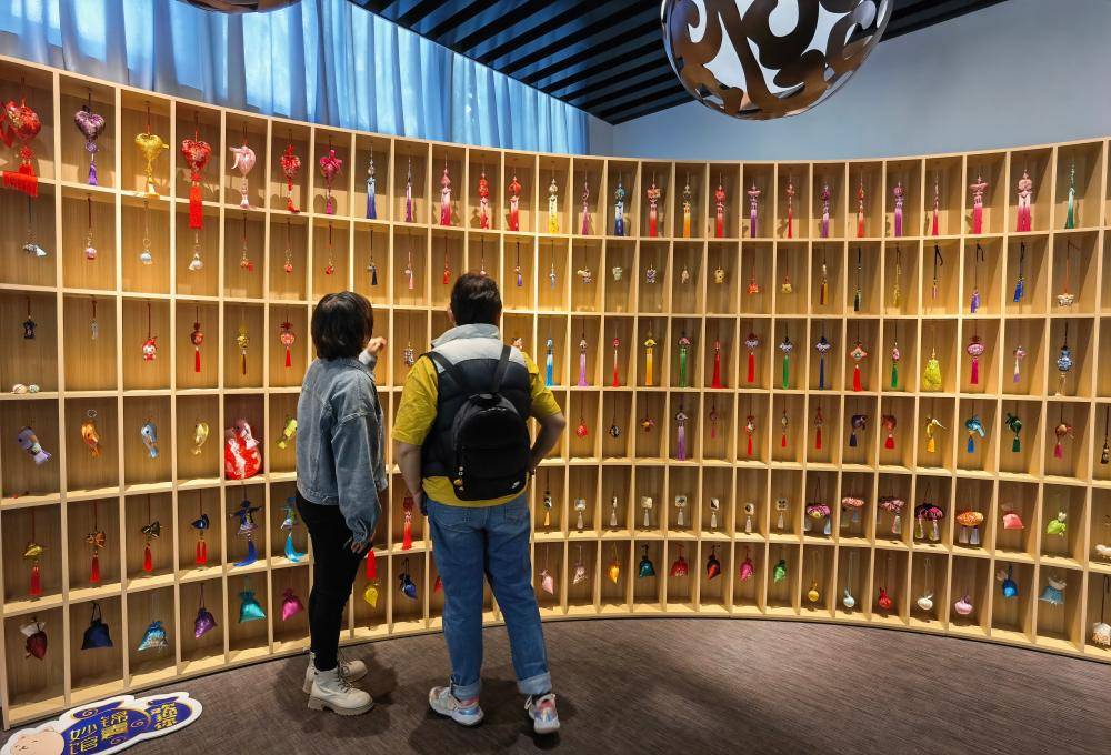 锦囊妙馆则是新虹街道打造的一个以香囊为主体的非遗传承基地,具备欣赏、体验、学习、交流、实践的功能。一进展馆,就可看到一面墙上陈列了几百个各式香囊,有常见的织物香囊,还有平时不太看到的竹香囊、金属香囊、玉香囊等。场馆分为欣赏体验区和学习交流区,其中,欣赏体验区分别以“观”“闻”“佩”“颐”“情”五个字来命名五个小块,概括了香囊的五个用途,“观”即观赏,“闻”即闻香,“佩”即佩戴和摆放,“颐”即药用和养生,“情”即表达情感和寄托情思。