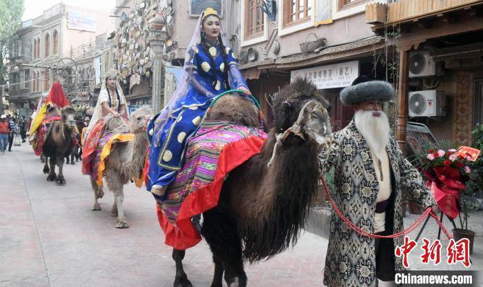 图为丝路驼队在喀什古城景区的街巷展演。 孙亭文 摄