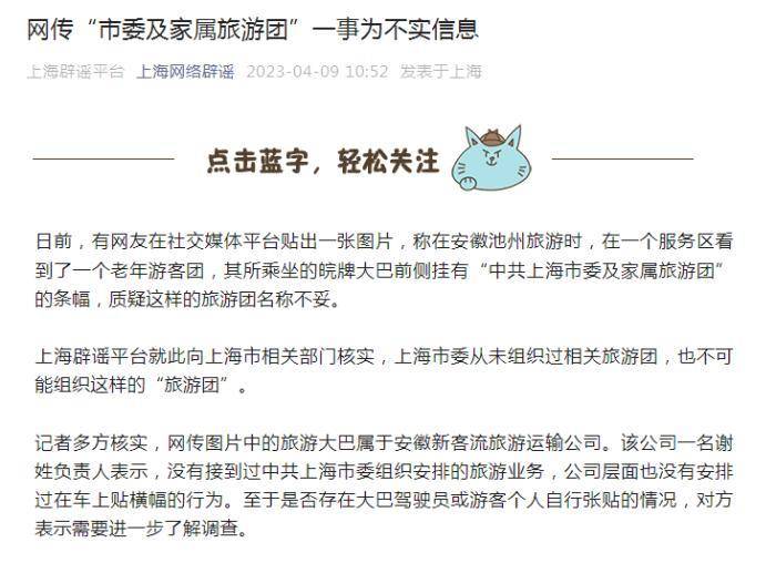 上海辟谣平台就此向上海市相关部门核实,上海市委从未组织过相关旅游团,也不可能组织这样的“旅游团”。