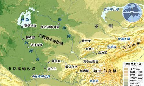 再往西有流经中亚地区的阿姆河,阿姆河是中亚地区最大的内流河,流经塔吉克斯坦、阿富汗、土库曼斯坦、吉尔吉斯斯坦,最终注入咸海。阿姆河沿途造就了无数绿洲,是中亚地区难得的粮食产地。