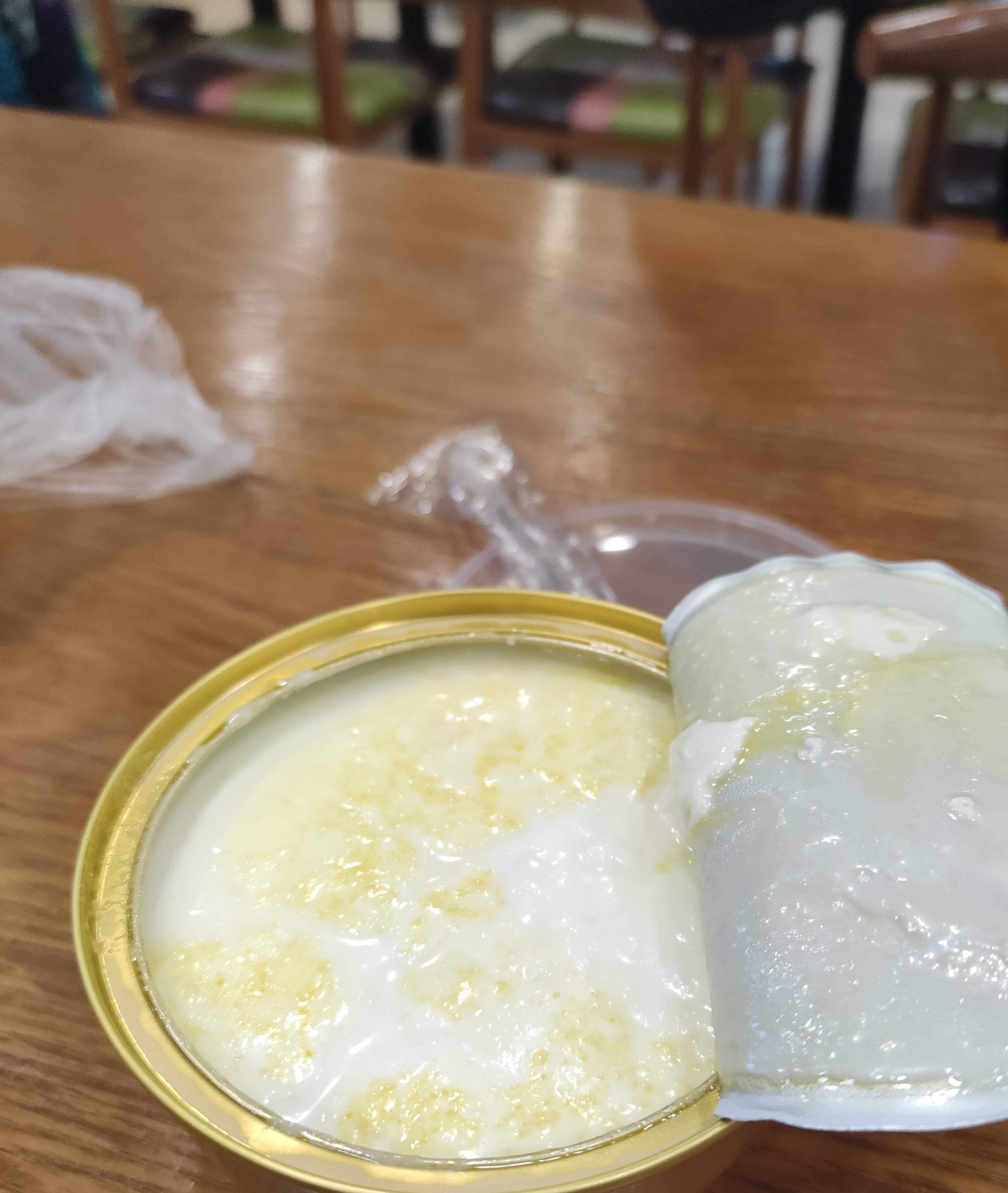 像如图这种黄色的奶皮子,是自然发酵后产生的,一定要有这个,才是这个酸奶的灵魂所在!这样的酸奶给我再多,都吃不腻!