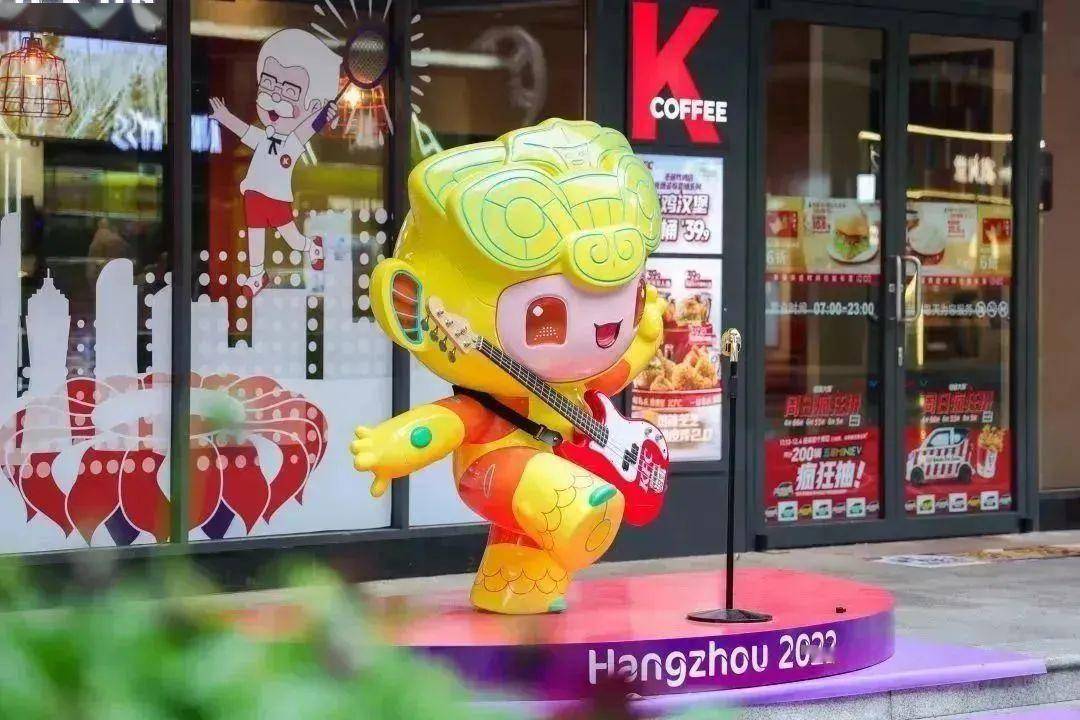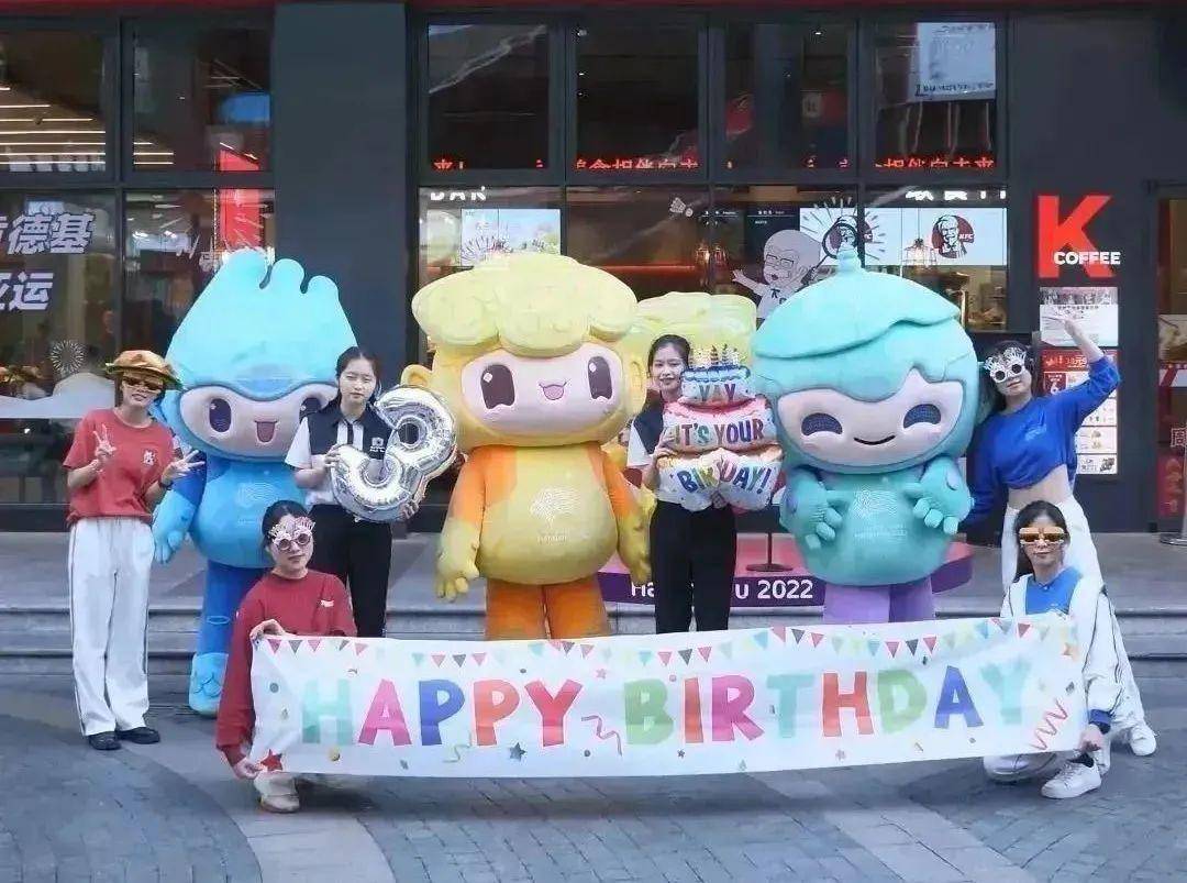 Congcong, Chenchen and Lianlian, the mascots of the Hangzhou Asian Games were celebrating their third birthday in Binjiang! They held a special birthday party in a KFC restaurant themed Asian Games on the Star Avenue, where there is also a Pizzahut themed Asian Games as a cross-border cooperation of “catering+sports” for new attempts to promote the Asian Games and display the Asian Games culture.