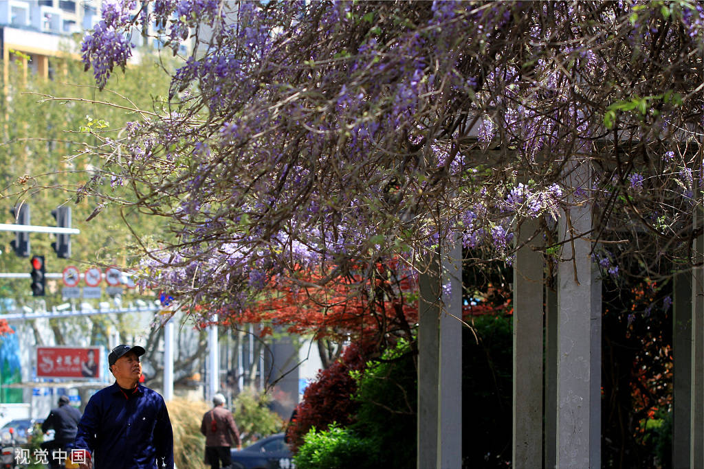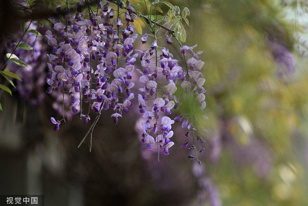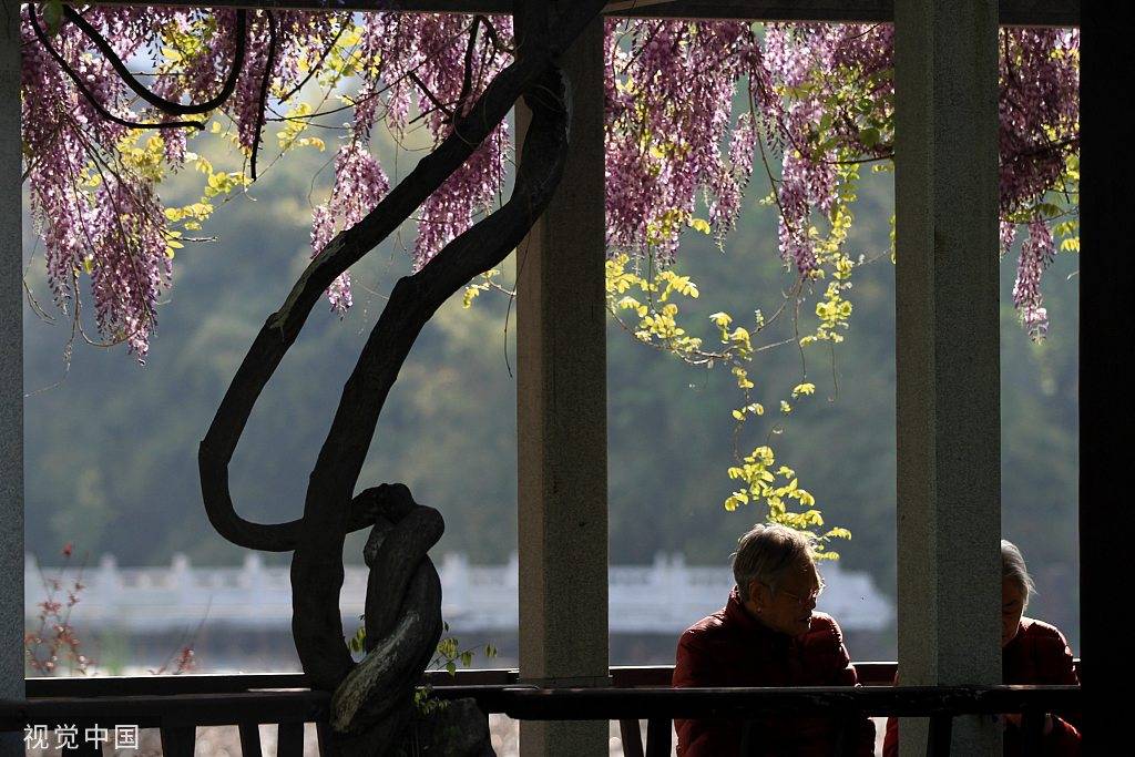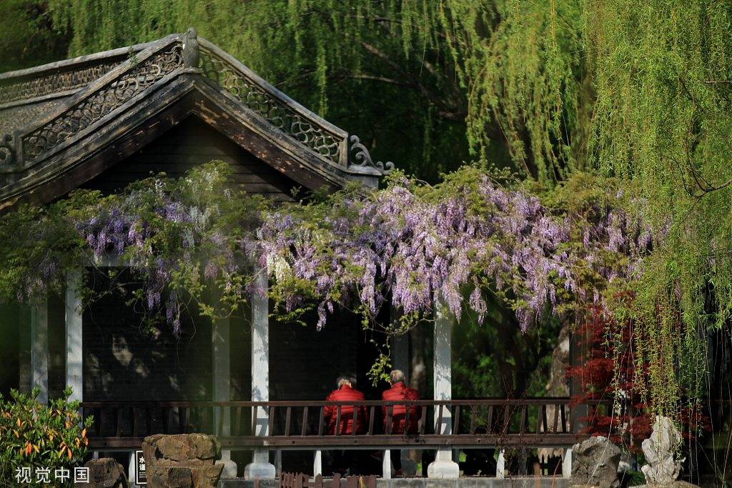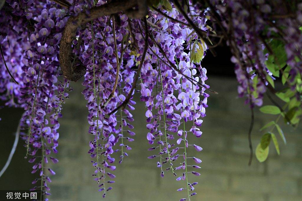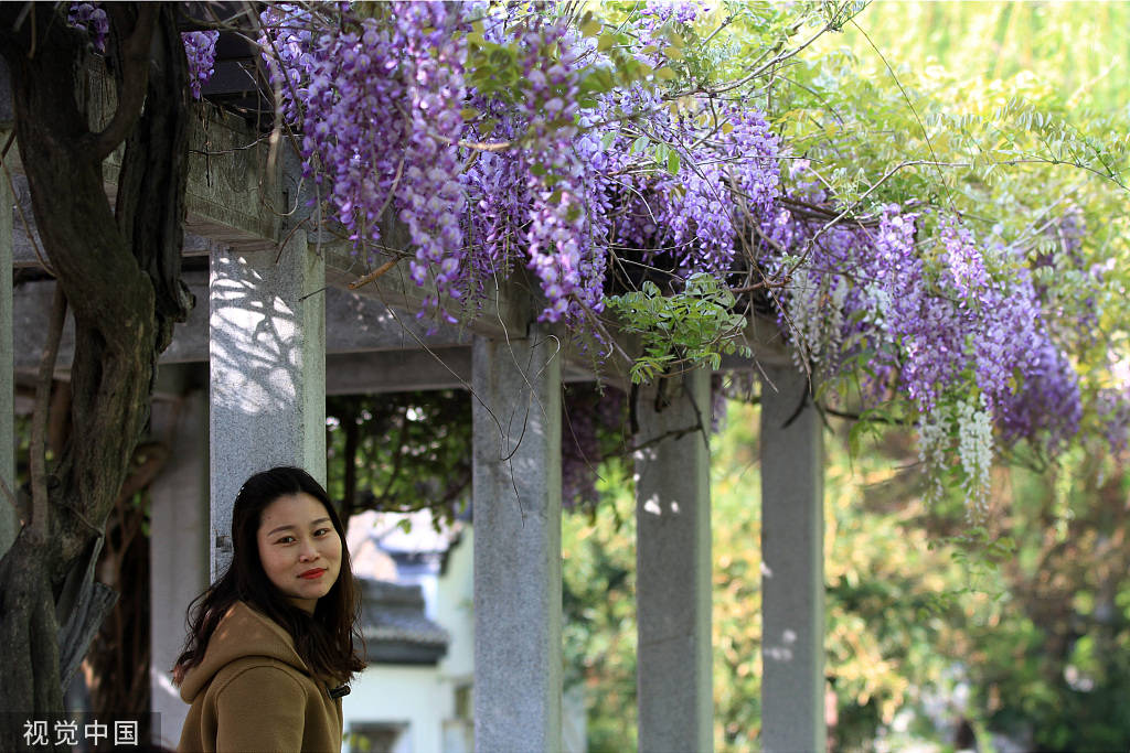 2023年4月8日-9日,江苏淮安,“清明”节气过后,百林园林清晏园内200余岁的紫藤花在细雨中盛开,吸引游人赏花拍照。