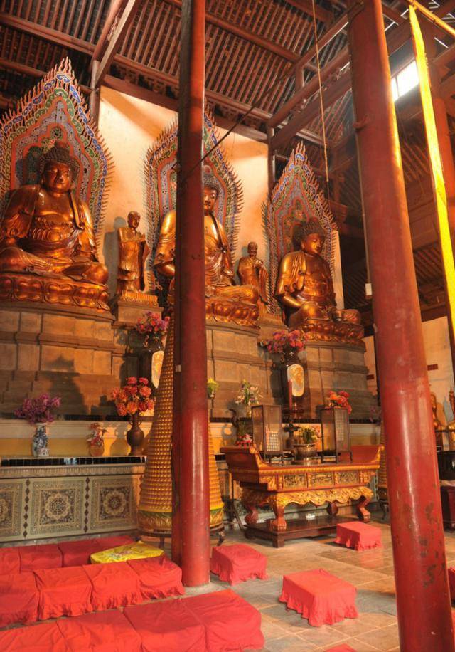 巍巍大雄宝殿,书写着“国泰民安”和“风调雨顺”。大殿内,法相庄严,经幢肃穆,法器俱全。正中坐于莲花高台之上的释迦牟尼大佛,两侧是他的十大弟子中的迦叶和阿难,东首坐着药师佛,西首坐着阿弥陀佛。佛坛背后是“海岛观音”泥塑群像。