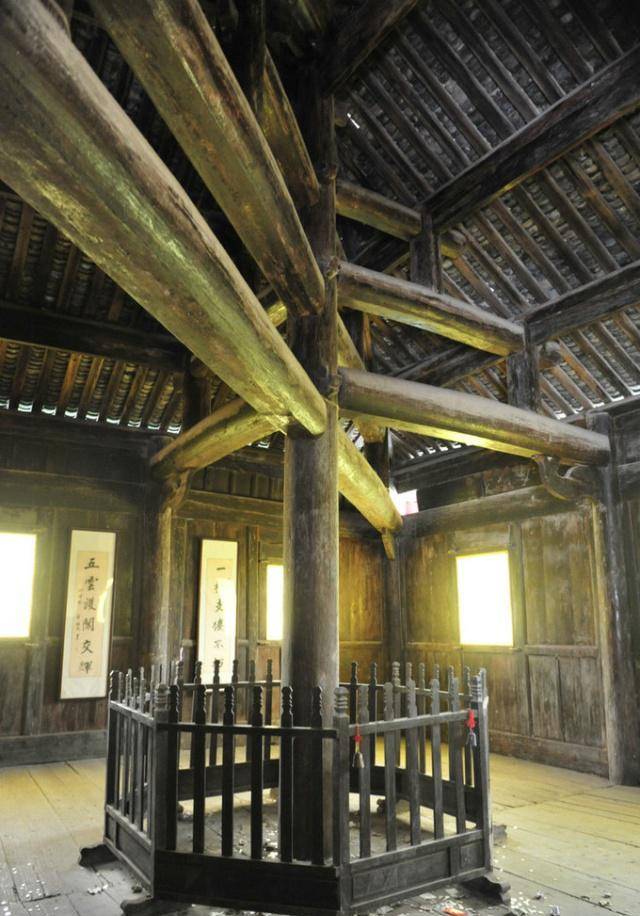 五云楼,其营造工艺相当讲究,各层内部厅堂房间因地制宜,各有变化。攀上顶层,巧夺天工的“一柱十二梁”闪亮登场——一根主体立柱上挺于屋中,十二根梁枋穿凿其上,相互叠搁,稳固而结实。它是力学与美学高度完美的结合,被誉为中国古建筑的奇迹。