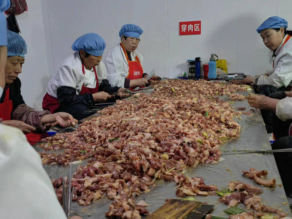 在一个巨大的不锈钢桌子前,羊肉切块码成小山一样的堆着,十个串肉串的阿姨每天从早上7点多就开始不停地串肉,仍然满足不了流水一样的菜单。