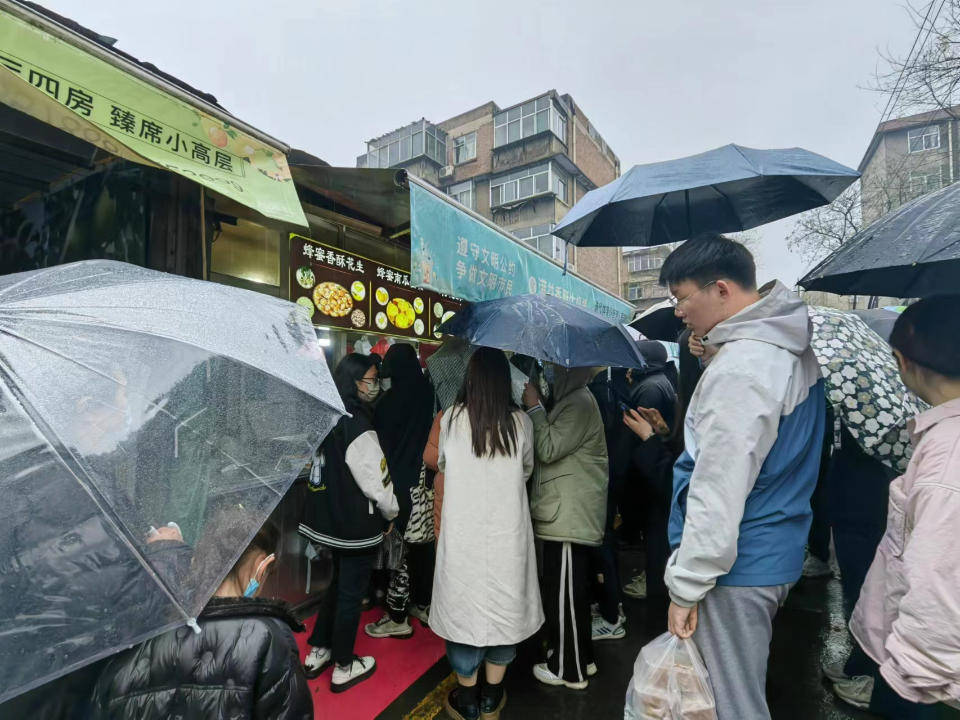 “这次是我们宿舍的一起来,上周是隔壁宿舍的过来。”手里提着各种小吃袋子,李乐乐已经在八大局早市的“网红”牛奶棒摊位前排队超过了半个小时。天空飘着蒙蒙细雨,牛奶棒摊位挤得水泄不通。