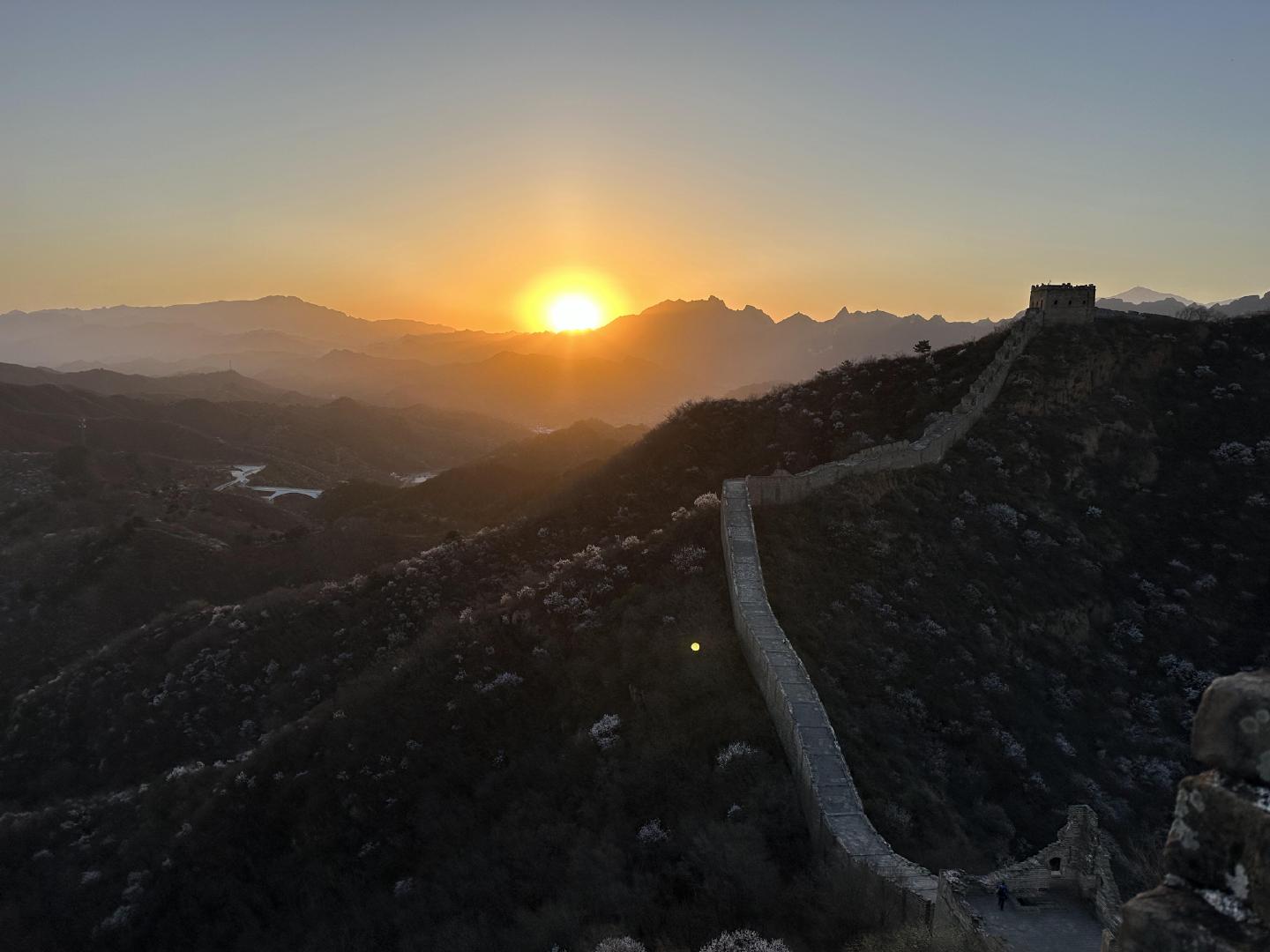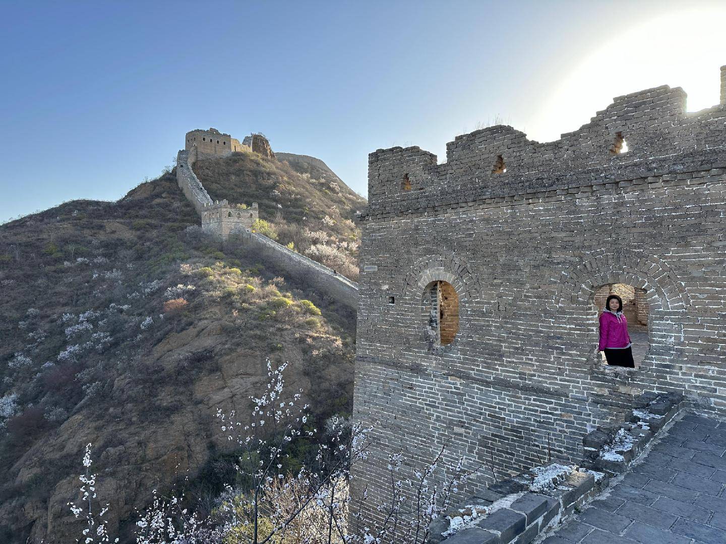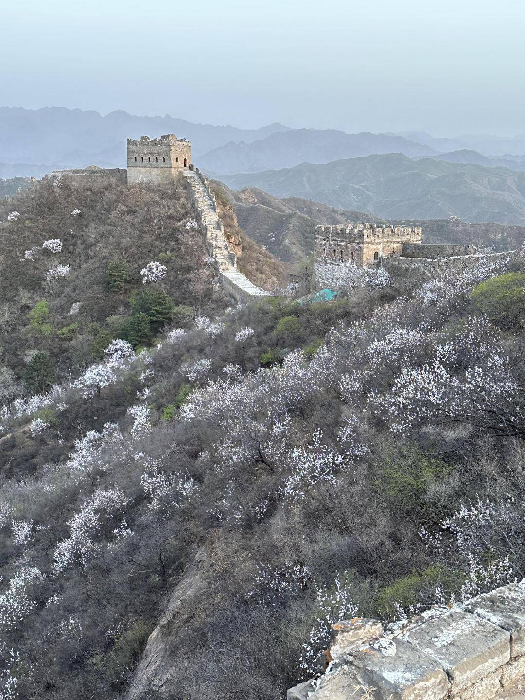 阳春四月,金山岭长城两侧漫山遍野的野生山杏花争相绽放,从蜿蜒的长城铺展开去,蔓延成一幅绝美画卷,把雄浑古朴的长城妆点得格外清丽。
