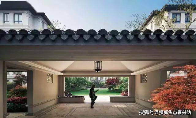 图:别墅区两栋别墅间景色,有特色连廊