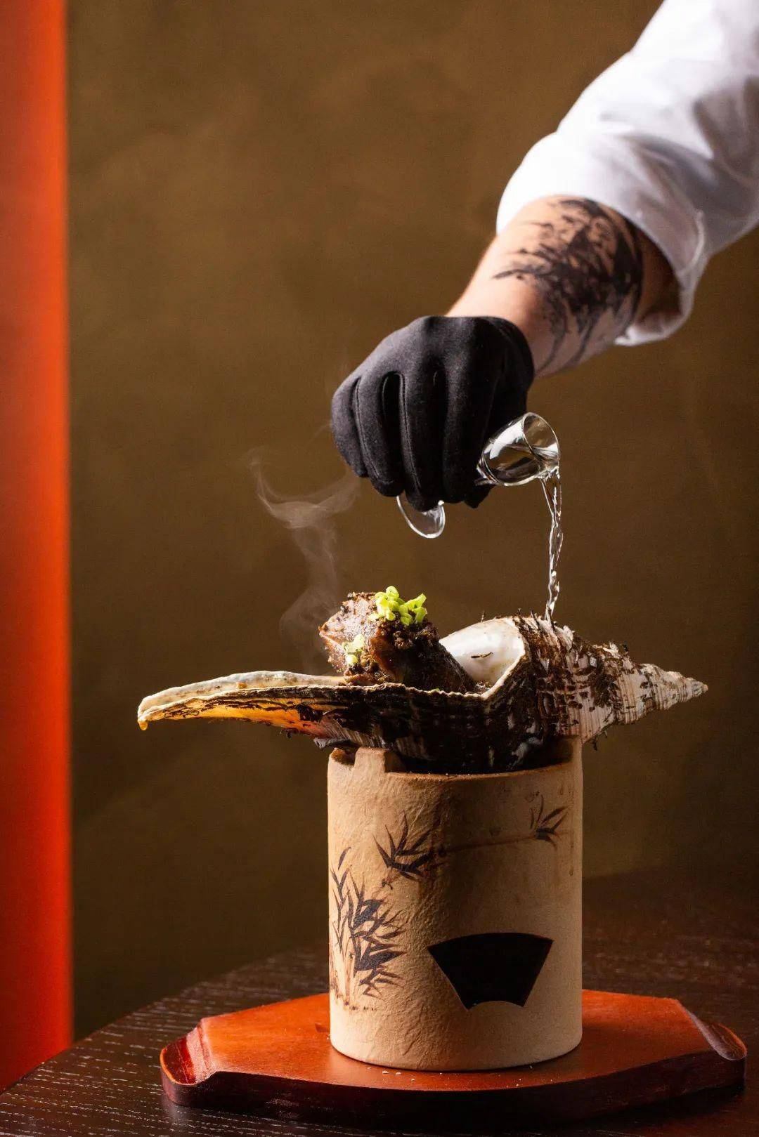 烹制炭烧响螺,必备的一份潮汕烧汁和一瓶高度白酒。潮汕烧汁用到火腿、肥膘肉、鸡清汤、川椒、头抽酱油等十几味材料,一起熬成浓浓的汤汁。硕大的响螺整个上炉,用白酒和烧汁反复灌浇、烧煮、冲洗。几小时后,螺肉烤熟,切成薄片,外表雪白无暇,尝之有火腿的香、白酒的醇、猪肉的丰腴和鸡汤的鲜美,它们都搭载在紧实微甜的螺肉上,这是中式烹饪的至高境界。