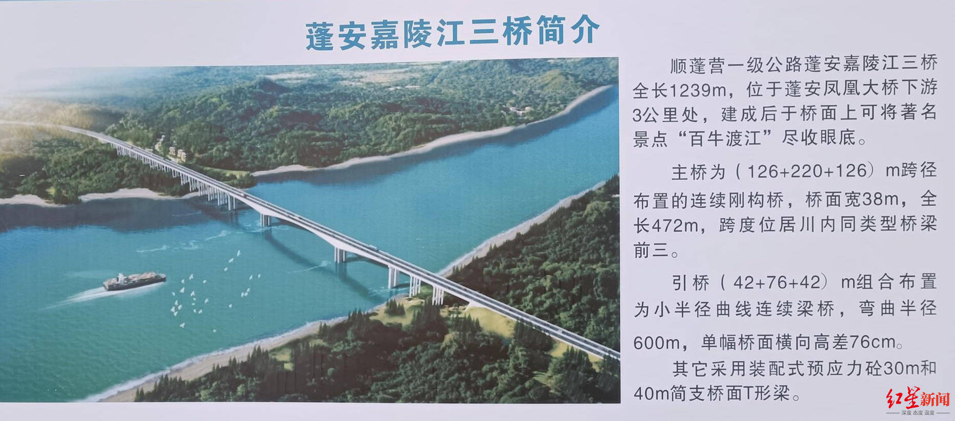 红星新闻记者了解到,顺蓬营一级公路蓬安段项目位于南充市蓬安县,而嘉陵江三桥正是该项目的关键控制性工程,桥梁全长1239米,桥面宽度38米,设计时速80公里/小时。据悉,该桥于2019年2月19日正式开工,位于蓬安凤凰大桥下游3公里处,建成后于桥面上便可将蓬安当地著名景点“百牛渡江”尽收眼底。