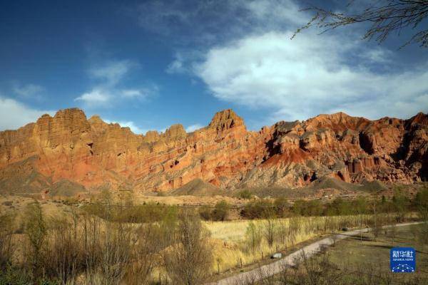 4月8日,游客行走在青海贵德国家地质公园丹霞地貌间。