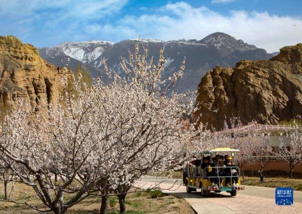 春暖花开的季节,位于青海省海南藏族自治州贵德县的贵德国家地质公园迎来春游的游客,盛开的春花与丹霞地貌、雪山构成一幅美丽的高原春色图。