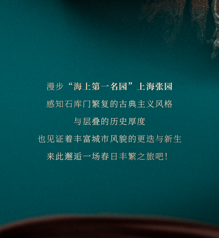 明媚的春日,漫步上海张园,一抹流动的蓝绿色,为石库门繁复的古典主义建筑更添盎然生机。
