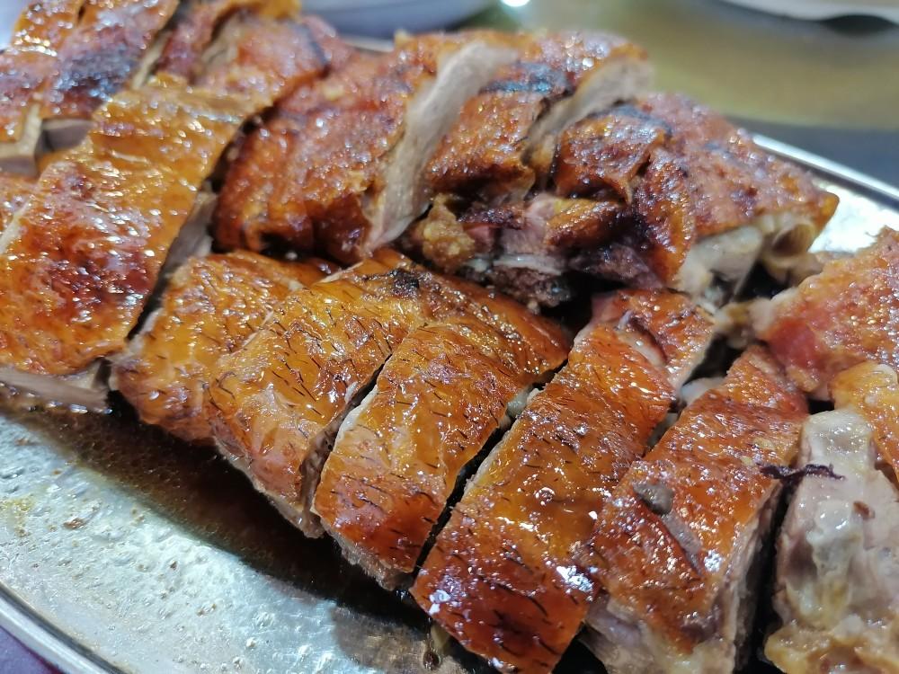 古井烧鹅,用陈皮腌制,再用陈年荔枝木烤制,外脆内嫩,焦中带点金黄,皮薄酥脆,还带有淡淡荔枝木的清香。