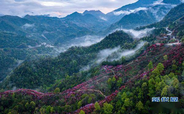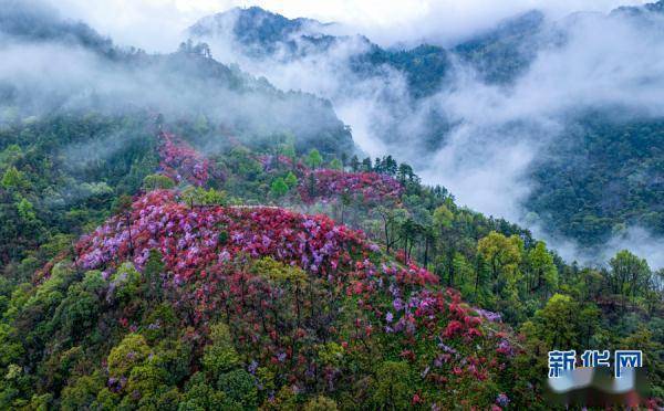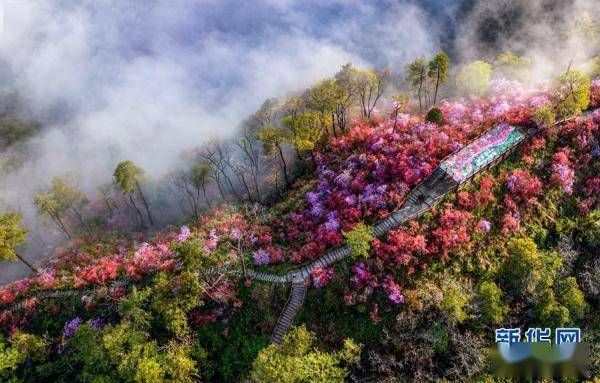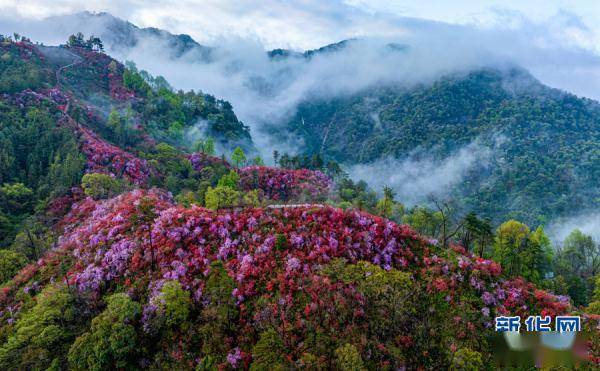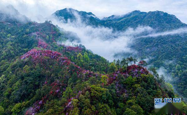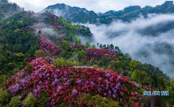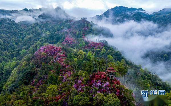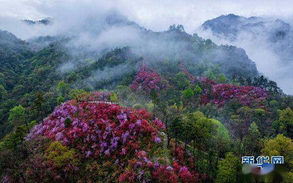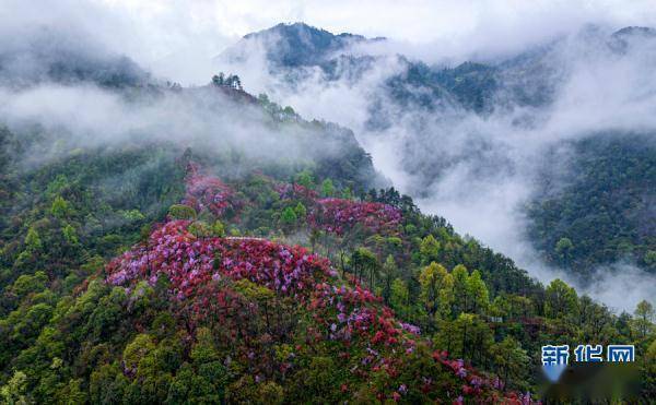 4月5日,安徽省安庆市岳西县河图镇天峡景区的千亩野生高山杜鹃竞相开放,美不胜收。当日,安徽省安庆市岳西县河图镇雨后天晴,天峡景区大峡谷云雾缭绕,山中姹紫嫣红。航拍镜头下,漫山遍野的杜鹃花迎风玉立,娇艳欲滴,如同春日的“花海盛宴”。新华网发(左学长 摄)