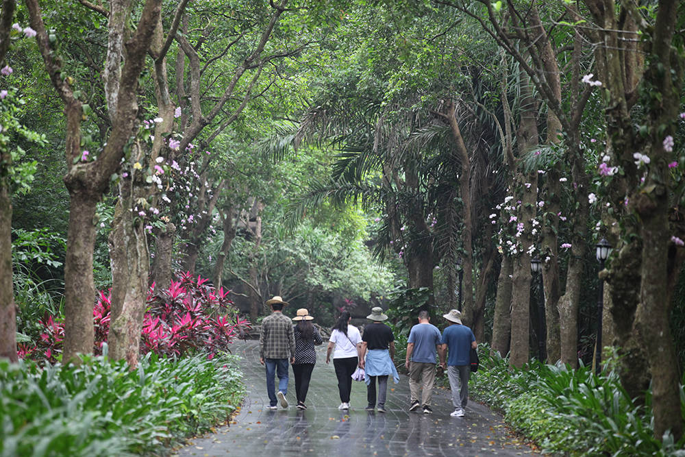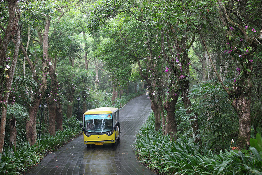 满载游客的循环电瓶车在开满兰花的行车道上行驶
