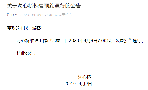9日7时30分,海心桥微信公众号发布公告:海心桥维护工作已完成,自2023年4月9日7:00起,恢复预约通行。
