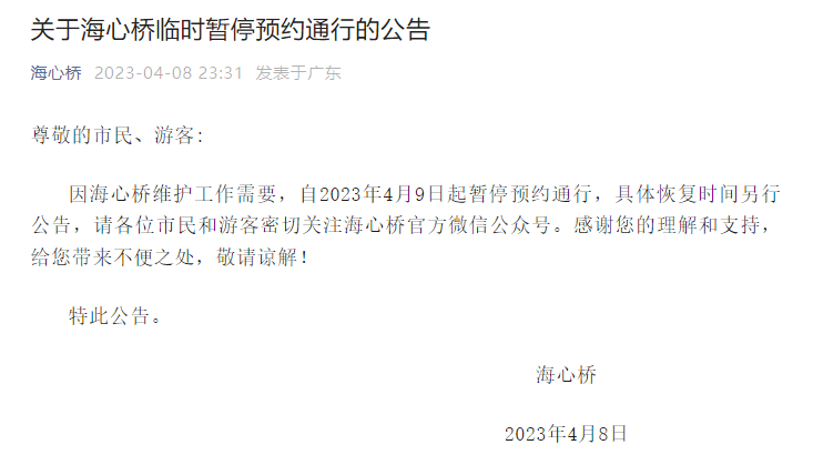 8日23时31分,海心桥微信公众号发布公告:因海心桥维护工作需要,自2023年4月9日起暂停预约通行,具体恢复时间另行公告。