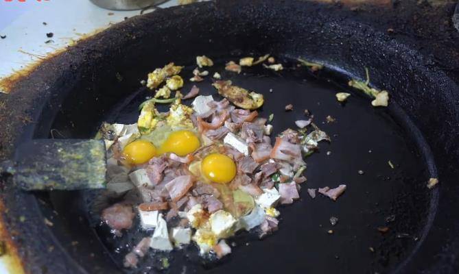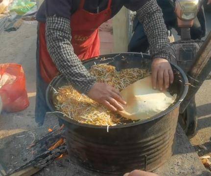 大铁锅里倒油炒肉丝,放入绿豆芽,再放入饼丝,炒出味道,打入鸡蛋丰富口感,趁热卷入煎饼中,趁热吃,香死个人啊!