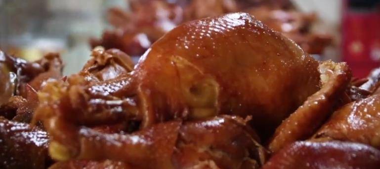 大山曾经是无棣的一个镇,这里出烧鸡已经有百年的历史,在整个滨州都有非常大的名气,烧鸡用的是小公鸡,毛要去干净,否则有膻腥味道,鸡经整形、盐腌入味,下锅卤制,成熟的烧鸡再用糖和松柏籽烤出的烟薰,一是上色,二是增加风味。出锅的的烧鸡,色泽红亮,鸡肉肉质鲜嫩,鸡肉脱骨,非常的耐嚼,肉质紧实,有口感,下酒少不了美味。